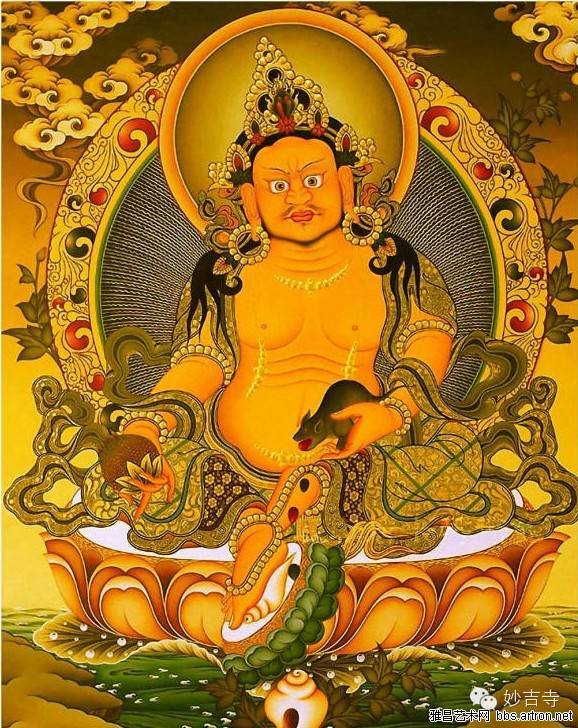 黄财神是藏传佛教各大教派普遍供养的五姓财神之一,因其身相黄色,故称黄财神。修持黄财神法、持诵其密咒,可获得黄财神庇,佑能增长福德、寿命、智能、物质及精上之受用,不被生活所逼,以及一切经济压迫,可安心向道。但修法者需发无上菩提心,广结善绿,勤行布施。万勿悭贪成性,护法降罪也. 黄财神即黄布禄金刚,黄财神面慈目善,头戴宝冠,坦胸露腹,戴着珍宝璎珞、珍宝耳环、珍宝手镯和珍宝足钏,上身穿丝制天衣,下身着丝制裙子,右手于右膝上捧喷焰末尼,左手握着吐宝鼬,以威镇坐姿坐在莲花宝座中央。身后有光环、祥云、远山。能增长福德、寿命、智慧、物质及精神上之受用。主司财富,能使一切众生脱于贫困,财源广进。 微信公众号:妙吉寺 洛桑陀美金刚上师微信:13591870196 洛桑陀美金刚上师公众号:洛桑陀美仁波切 妙吉寺官方网站:http://www.cymjs.com 《菩提道次第广论》亿遍大威德、文殊菩萨共修讲堂 新浪SHOW:490502