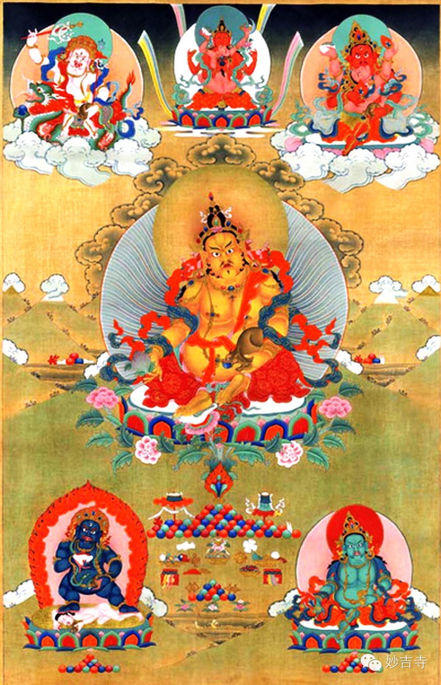 当初释迦牟尼佛在灵鹫山宣说大般若时,诸魔鬼神等皆前来障碍,令高山崩塌,大众惊慌,此时黄财神就现身庇护,后来世尊嘱咐黄财神,当于未来世帮助一切贫困众生,为大护法。诚心诵持黄财神心咒,可获得其庇护,能财源广进,免除贫穷和一切经济窘困。如果能发无上菩提心,发愿救度一切众生于贫困,则福德更不可限量。中央为黄财神,其功德:黄财神是藏传佛教各大教派普遍供养的五姓财神之一,因其身相黄色,故称黄财神。